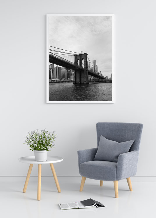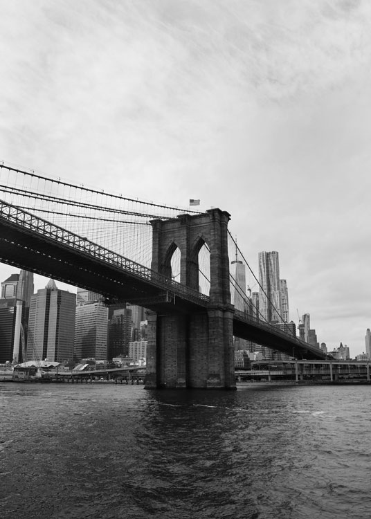 Kaunis mustavalkoinen valokuvajuliste Brooklyn Bridgesta Hudson joelta kuvattuna.